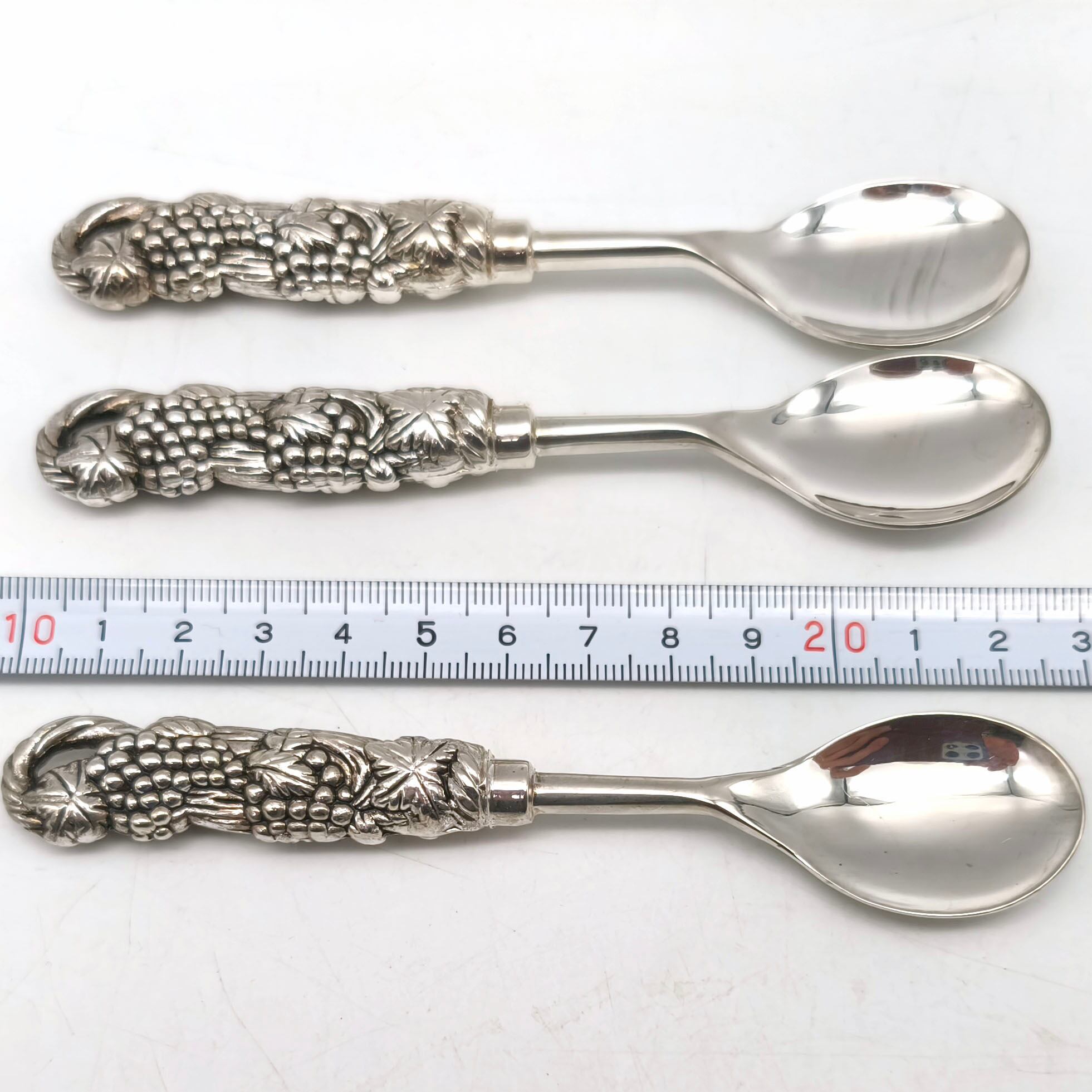 長さ:約125㎜、3本重さ:約130g、1本あたり重さ:約43〜44g、外箱なし、状態ランク:C 商品は画像に写っているものが全てです。清掃前は銀特有の黒ずみがあり、また磁石にも反応しなかったため、銀製のスプーンであると判断しました。若干の小キズやヨゴレが見受けられます。その他状態は画像をご確認ください。