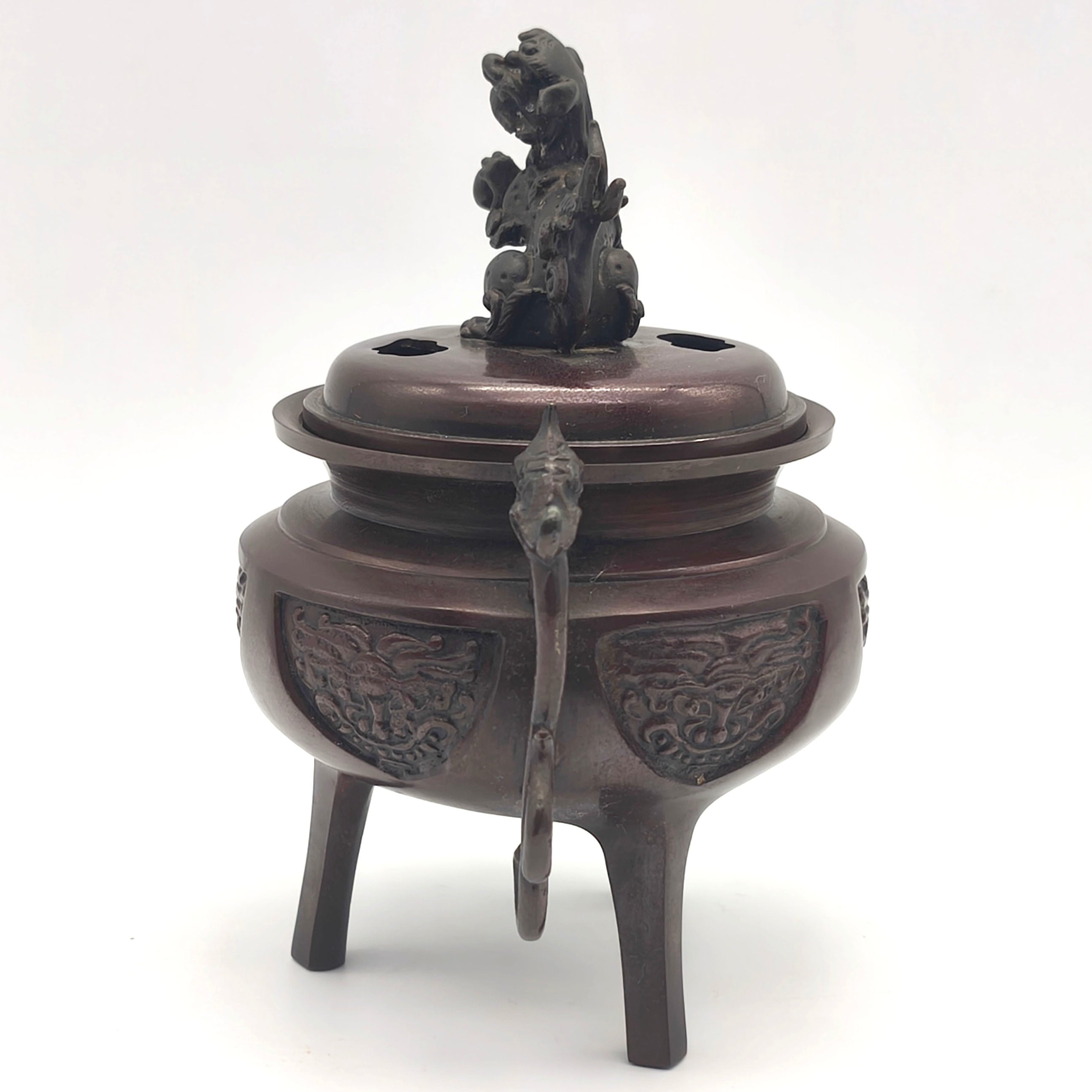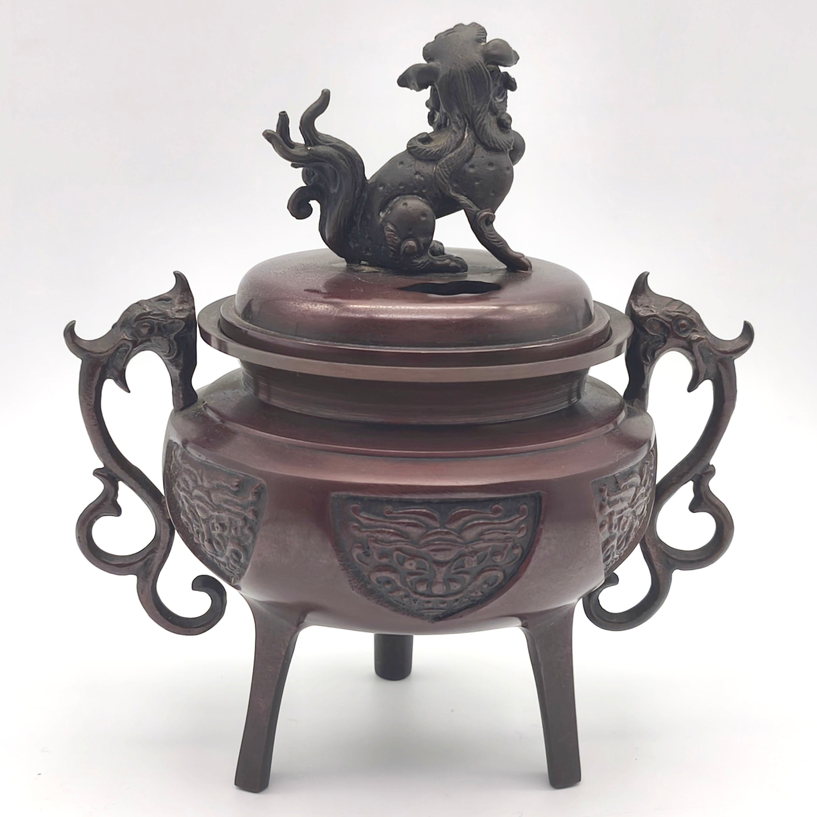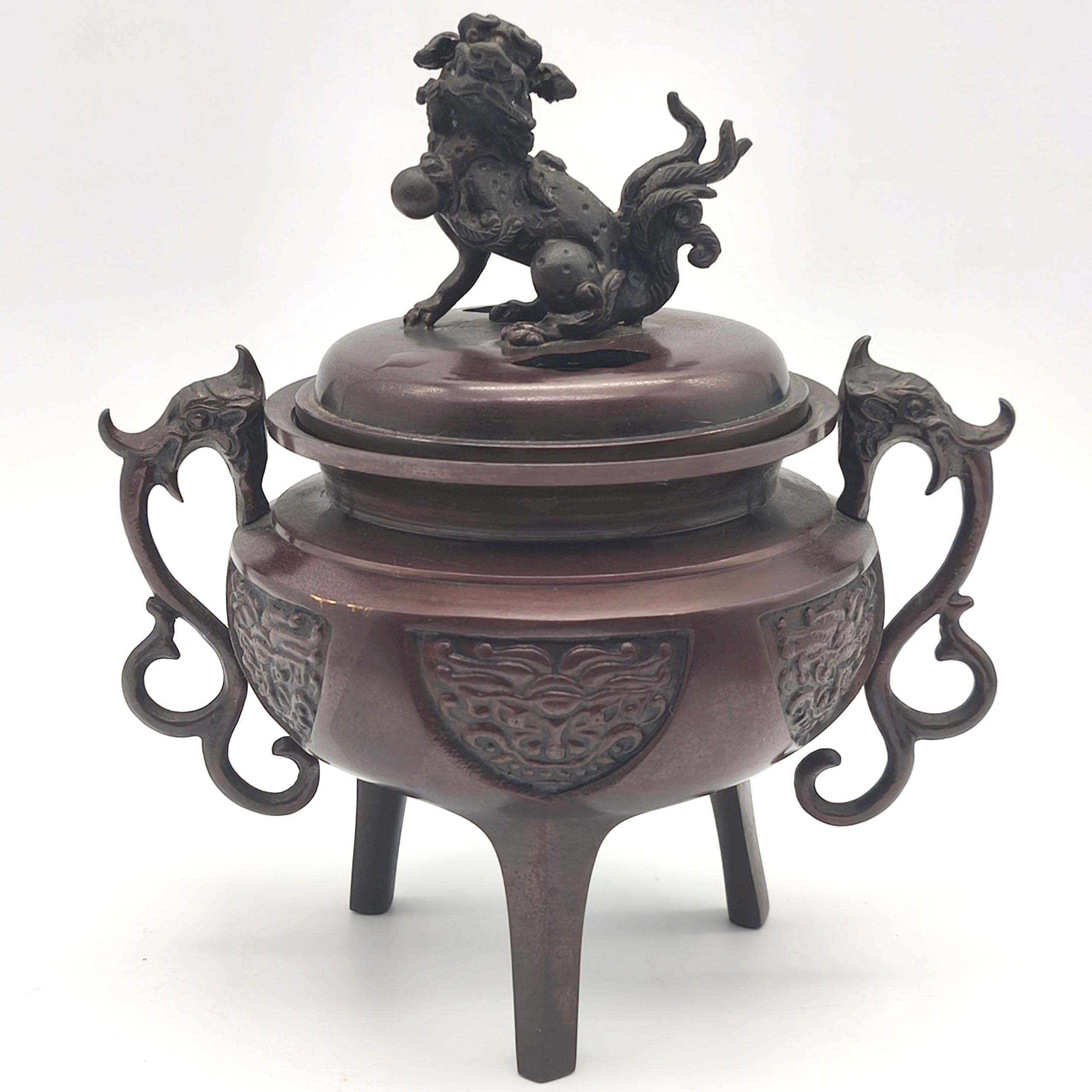 香炉サイズ(幅×奥行×高さ):約150×110×165㎜、外箱なし、状態ランク:C 共箱等が無いため詳細は不明ですが画像検索したところ高岡銅器の可能性が高いです。商品は画像に写っているものが全てです。使用による小キズやヨゴレが見受けられます。その他状態は画像をご確認ください。