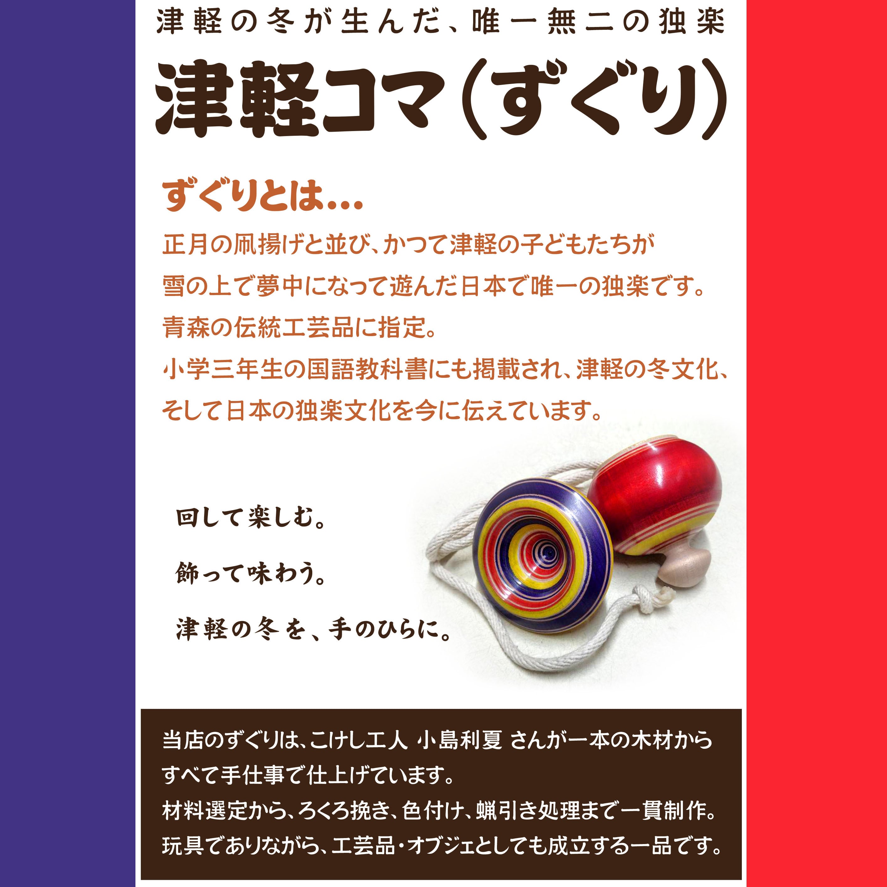 直径:約76㎜(2.5寸)、高さ:約80㎜、独楽紐長さ:約1280㎜、状態ランク:S ※画像はイメージです。手作り品のため色・柄・サイズに若干の個体差があります。あらかじめご了承ください。(津軽のずぐり:https://www.youtube.com/watch?v=-Pgvbjkm2Vk)(【青森の魅力】雪上に独楽、津軽ずぐり回し − 黒石市 全日本ずぐり回し選手権大会:https://www.youtube.com/watch?v=o_mG1-phsvg)