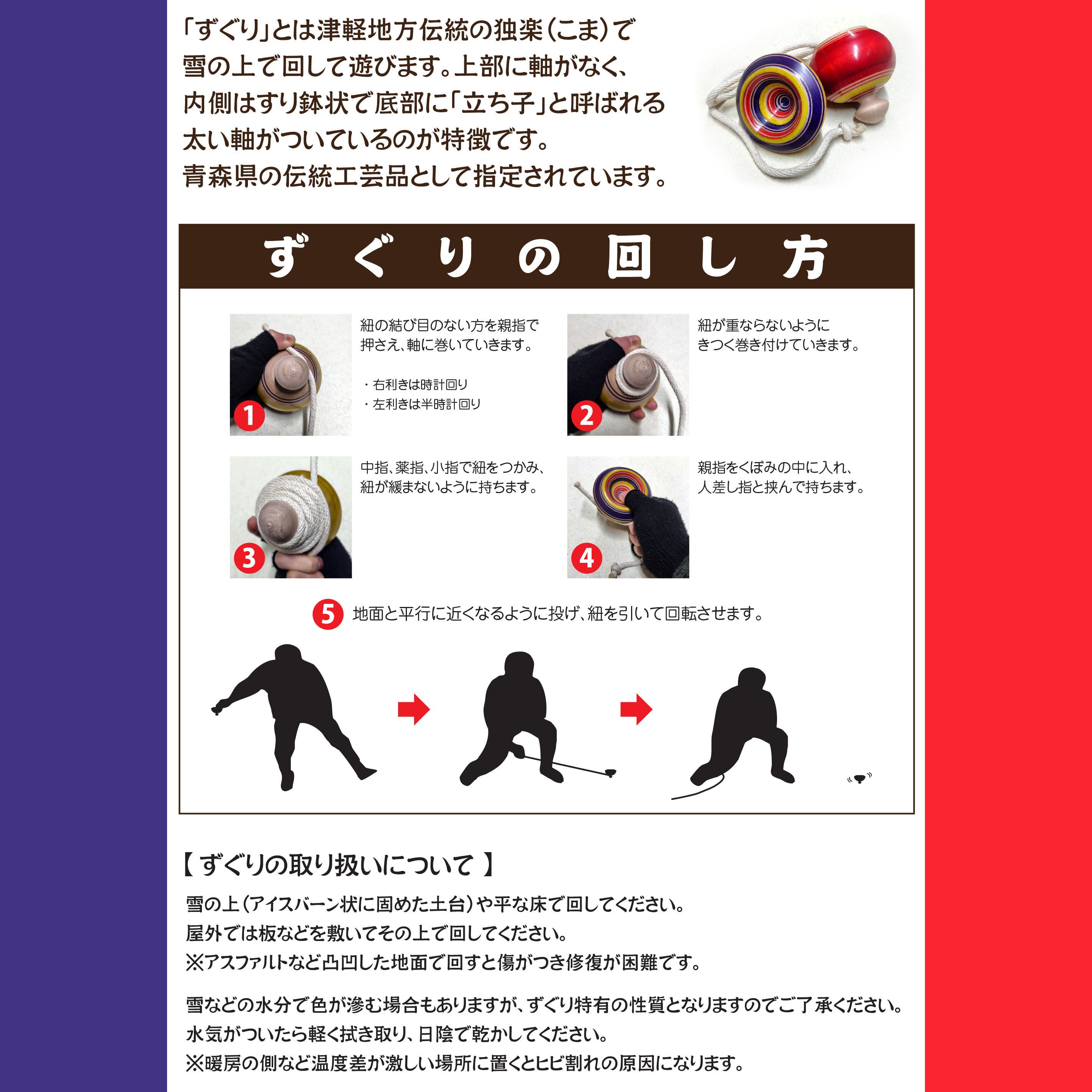 直径:約76㎜(2.5寸)、高さ:約64㎜、独楽紐長さ:約1280㎜、状態ランク:S ※画像はイメージです。手作り品のため色・柄・サイズに若干の個体差があります。あらかじめご了承ください。(津軽のずぐり:https://www.youtube.com/watch?v=-Pgvbjkm2Vk)(【青森の魅力】雪上に独楽、津軽ずぐり回し − 黒石市 全日本ずぐり回し選手権大会:https://www.youtube.com/watch?v=o_mG1-phsvg)