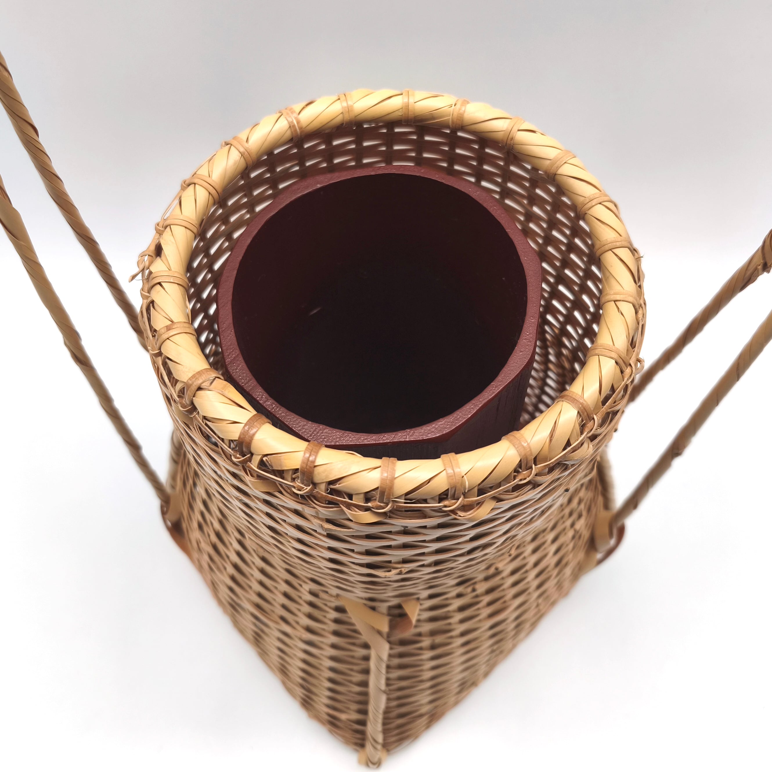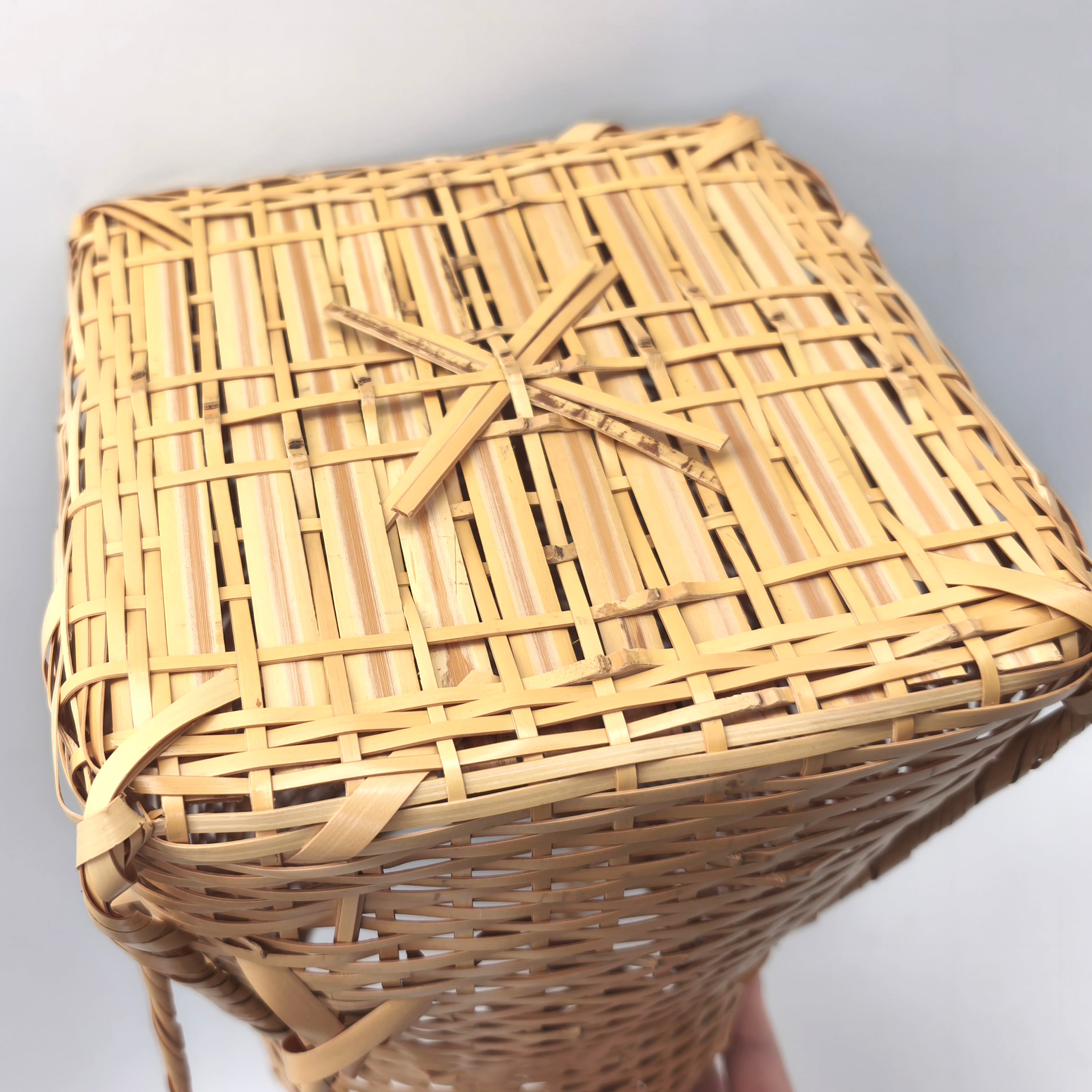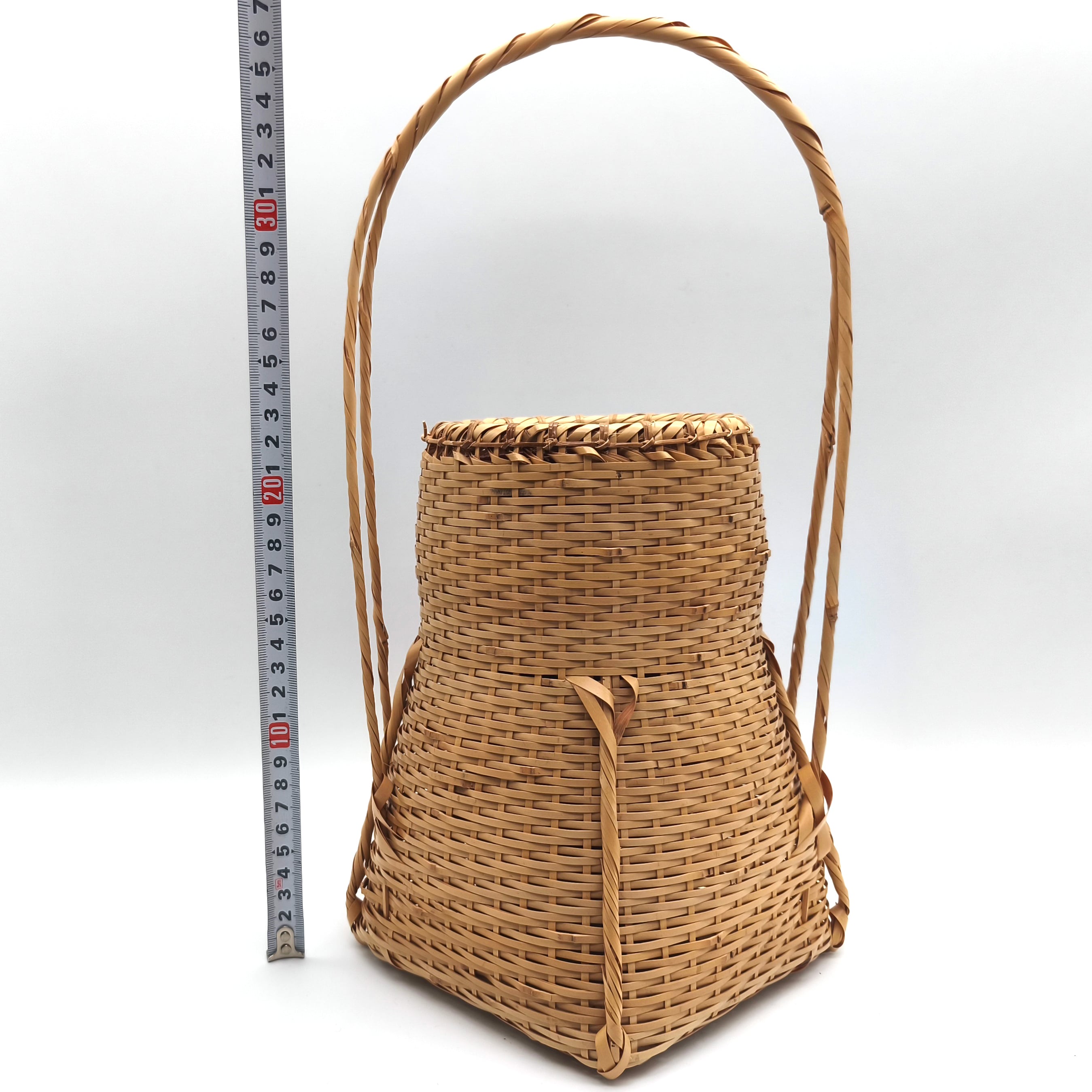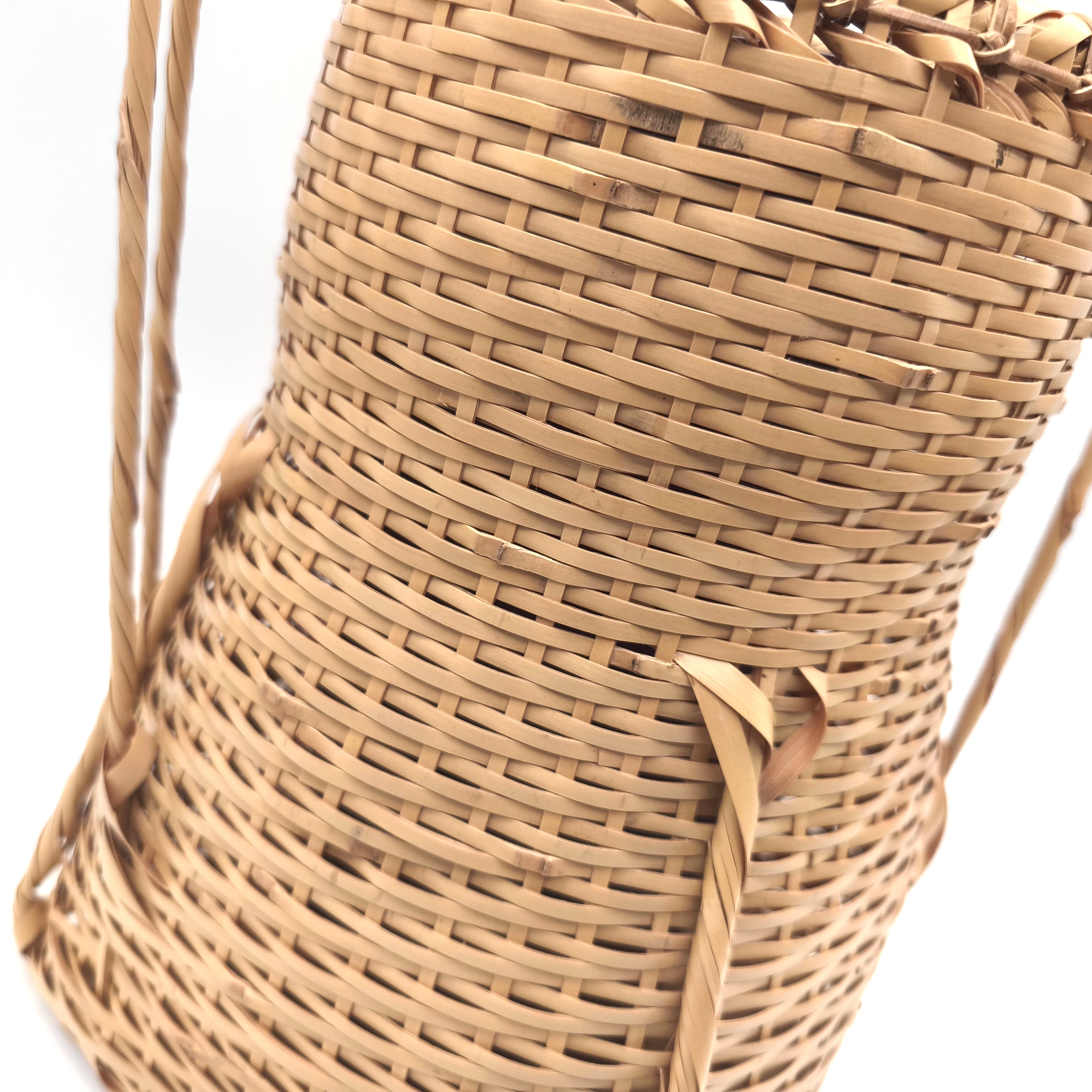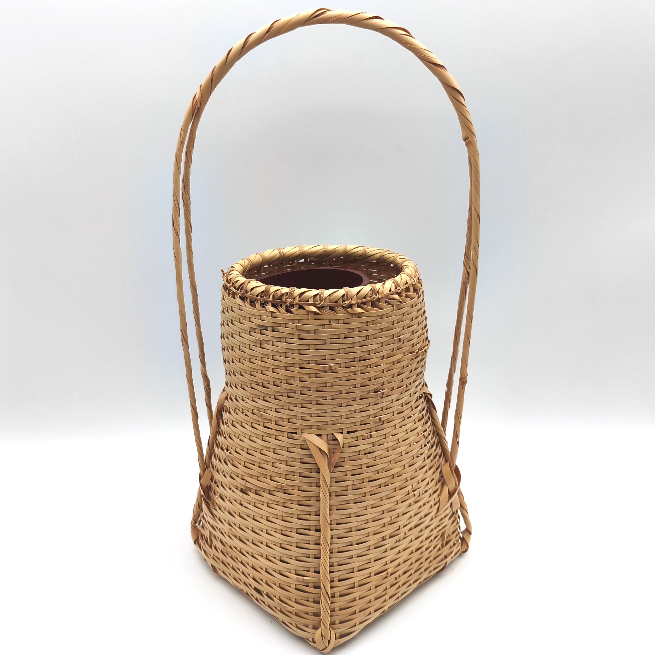 籠サイズ(幅×奥行×持手込み高さ):約210×210×370㎜、花筒サイズ(直径×高さ):約85×203㎜、共箱なし、状態ランク:B 商品は画像に写っているものが全てです。目立つキズやヨゴレはありません。その他状態は画像をご確認ください。