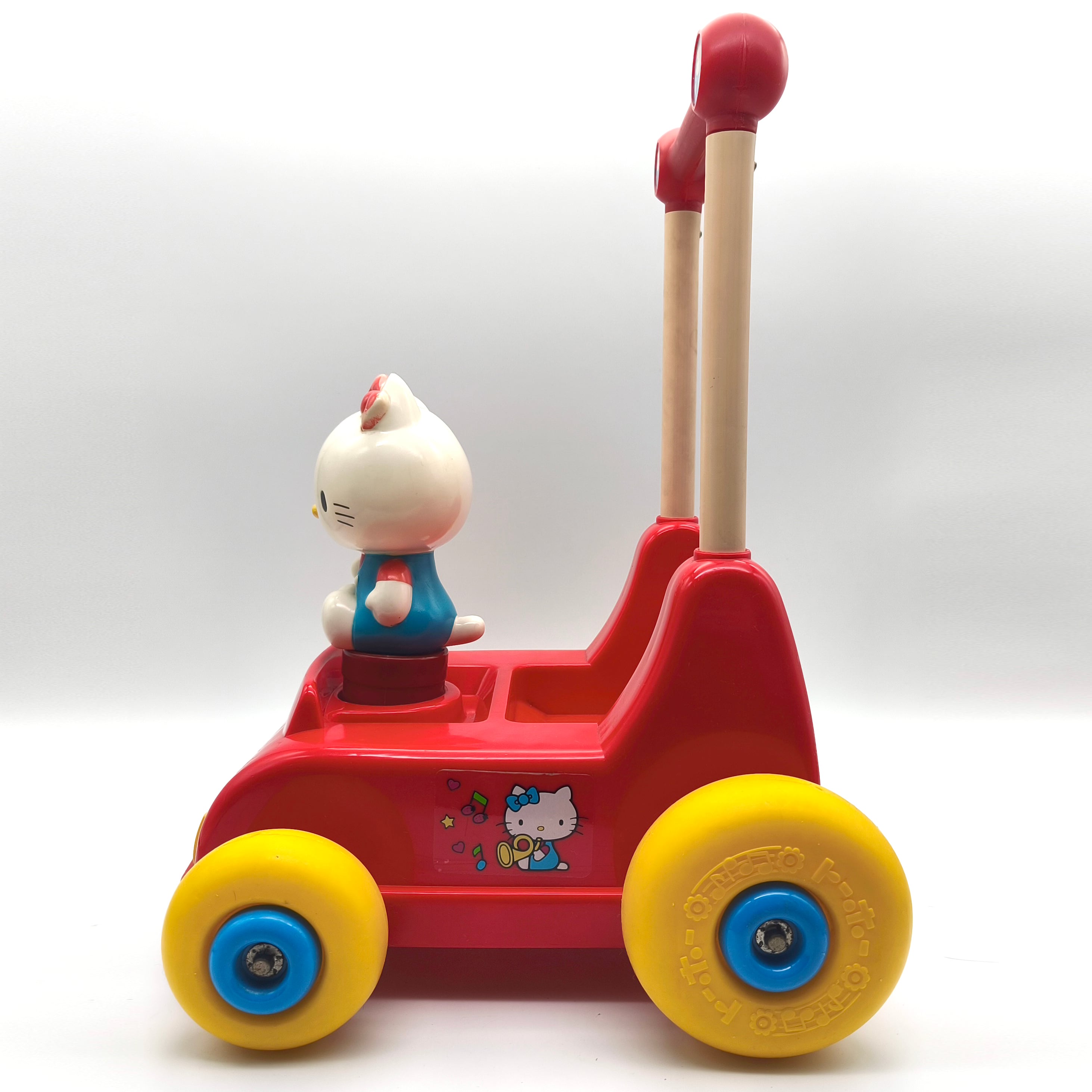 サイズ(幅×奥行×高さ):約320×300×415㎜、外箱なし、状態ランク:D 商品は画像に写っているものが全てです。後輪が回るとハンドベルのような音色が鳴り、前輪が回るとキティちゃんの人形が上下に動く仕組みです。全体的にキズやヨゴレが見受けられます。その他状態は画像をご確認ください。