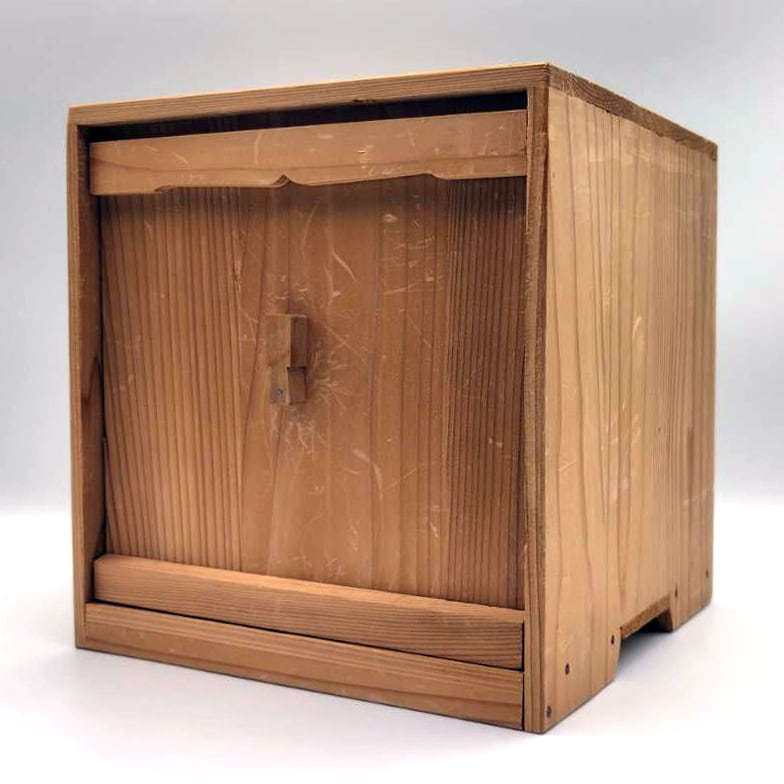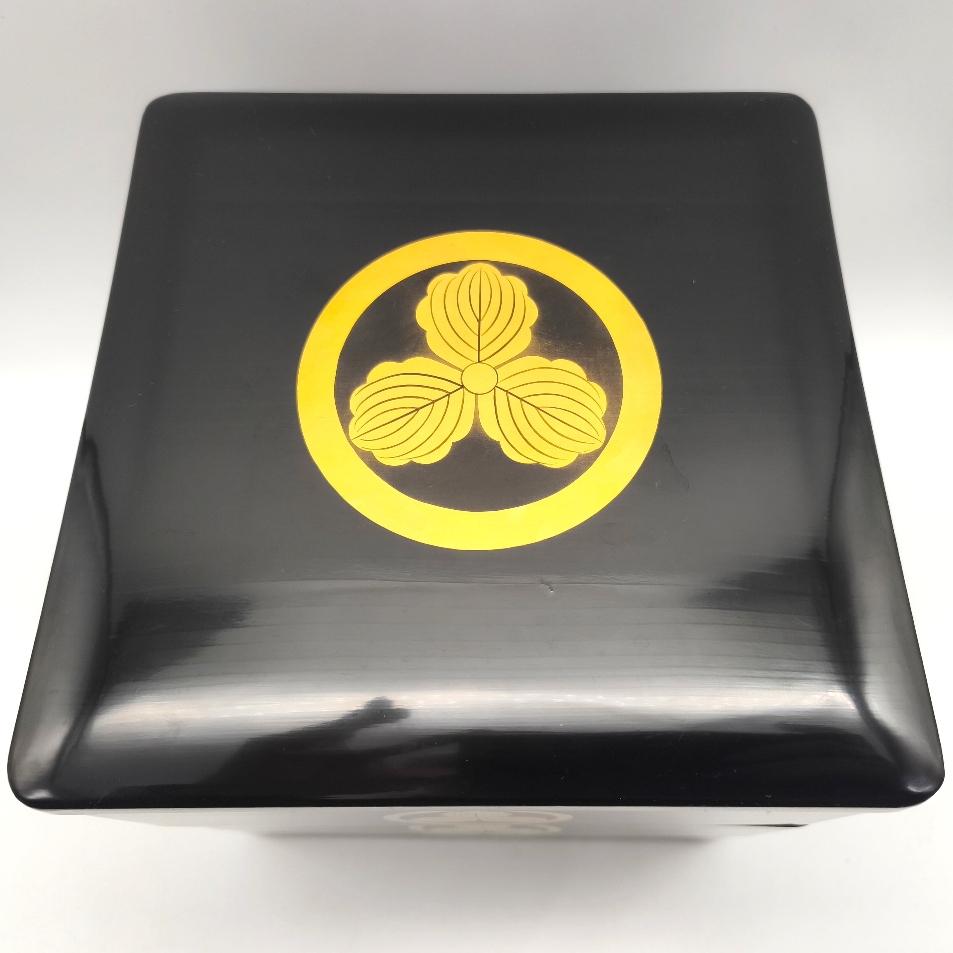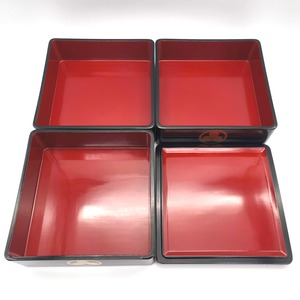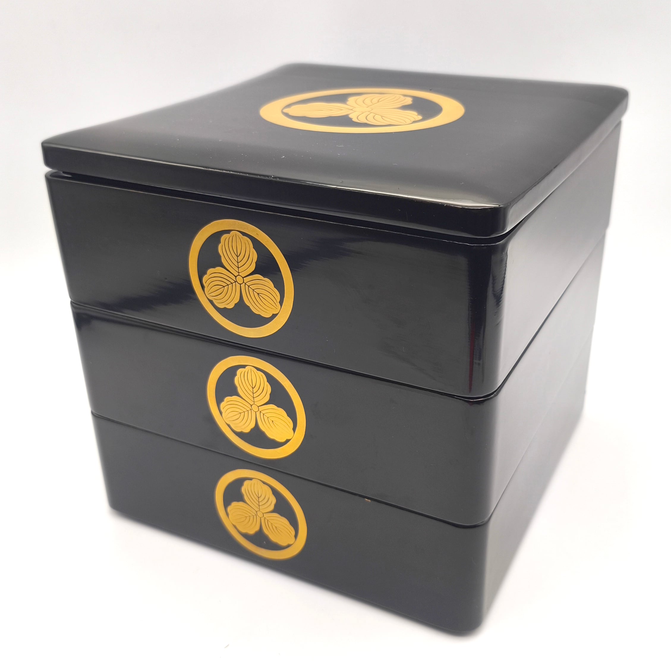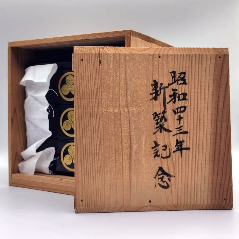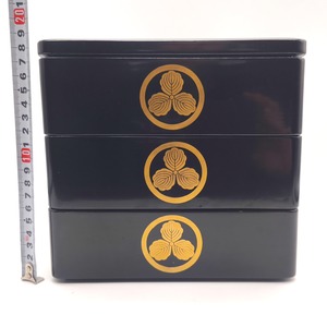 重箱サイズ(幅×奥行×高さ):約195×195×190㎜、素地:天然木、家紋:丸に三つ柏、状態ランク:D 商品は画像に写っているものが全てです。上蓋に歪み(反り)が見受けられます。その他状態は画像をご確認ください。