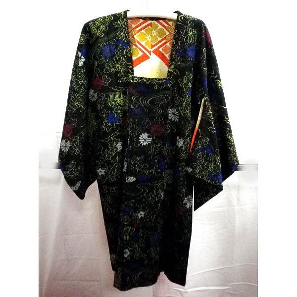 身丈:100cm、肩裄:63cm、袖丈:49cm、袖幅:33.5cm、前幅:全体で48cm、後ろ幅:全体で58cm、適応身長:155cm以下、生地:正絹、地色:黒、柄:流水柄・お屋敷・四季の植物柄、状態:目立つ汚れなし。黒地に赤紫・青黄の柄が映えるとてもモダンでアンティークな道行コートです。年齢層も広く、自分流にアレンジできます。コート裏に正絹の古典柄を使用しています。着用の他、インテリア、リフォーム等にもどうぞ。