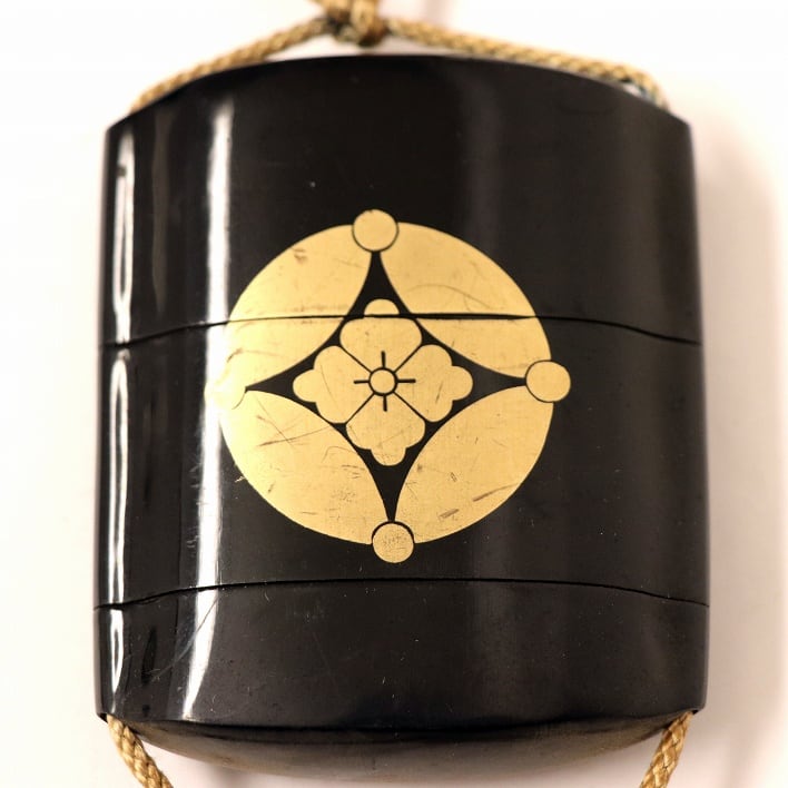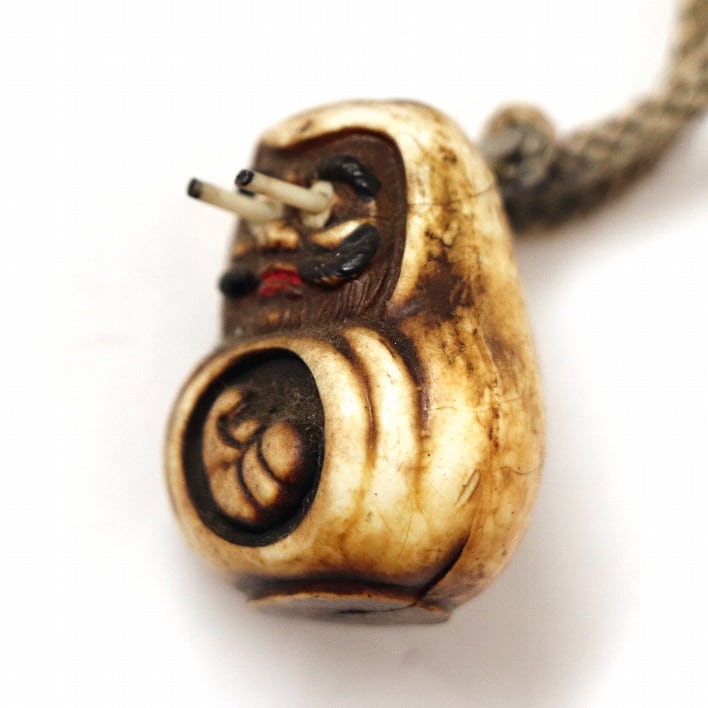 印籠(縦:約350mm、横:約67mm、おそらくプラスチック、ヒビあり)、根付の材質は不明です。