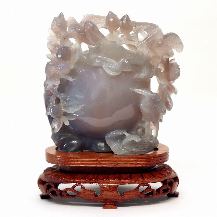 台座込みサイズ(幅:約110mm、奥行:約70mm、高さ:約140mm、重さ:約571g)、箱の特徴から中国製と思われます。石は紫翡翠のように見えますが栞等ありませんので詳細は不明です。状態ランク:B