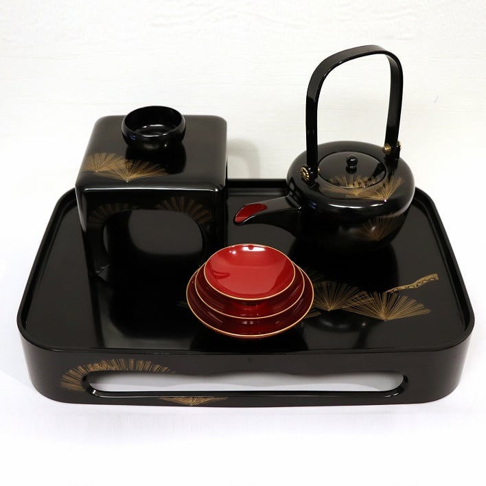 屠蘇器(縦:約108mm、横:約168mm、高さ:約105mm)、大盃(直径:約99mm、高さ:約35mm)、中盃(直径:約84mm、高さ:約30mm)、小盃(直径:約69mm、高さ:約26mm)、キズ汚れあり。