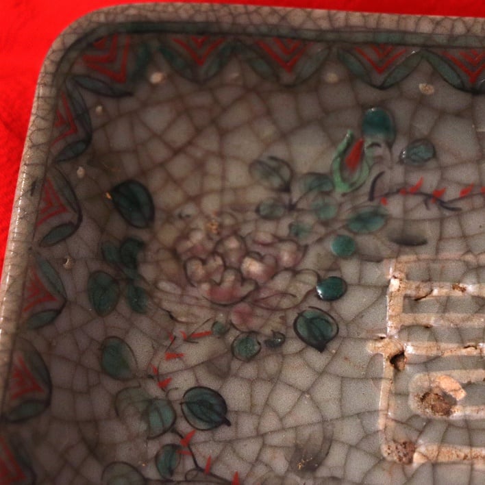 縦:約167mm、横:約120mm、高さ:約26mm、富貴長春とは中国から伝わった四字熟語で、富が豊かで身分も高く長生きするという意味の縁起が良い熟語です。箱が無く、銘が見えないため、日本産なのか中国産なのか、墨貫入なのか使い込まれて濃くなった貫入なのか、詳しい事はわかりませんが、だいぶ古いものだと思います。