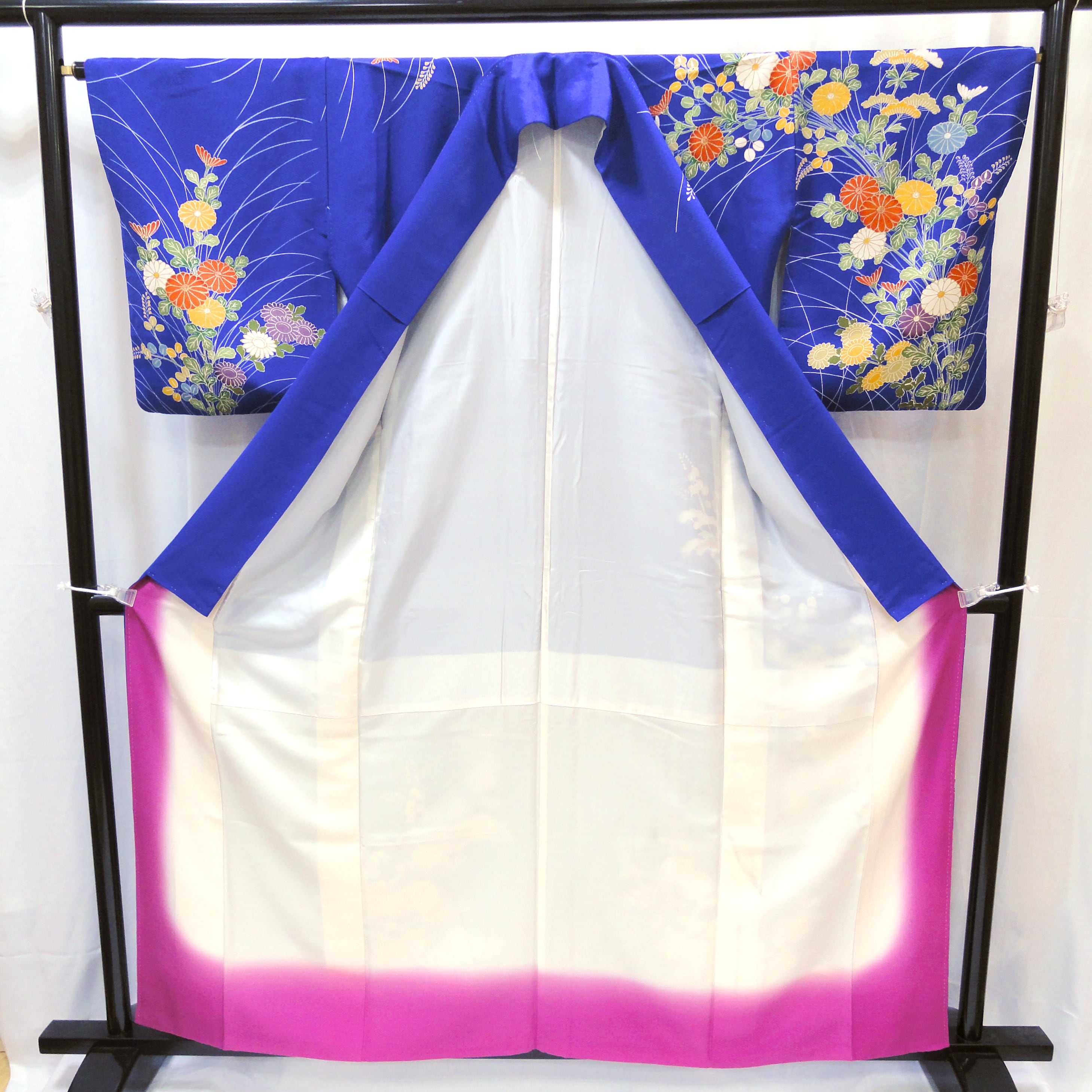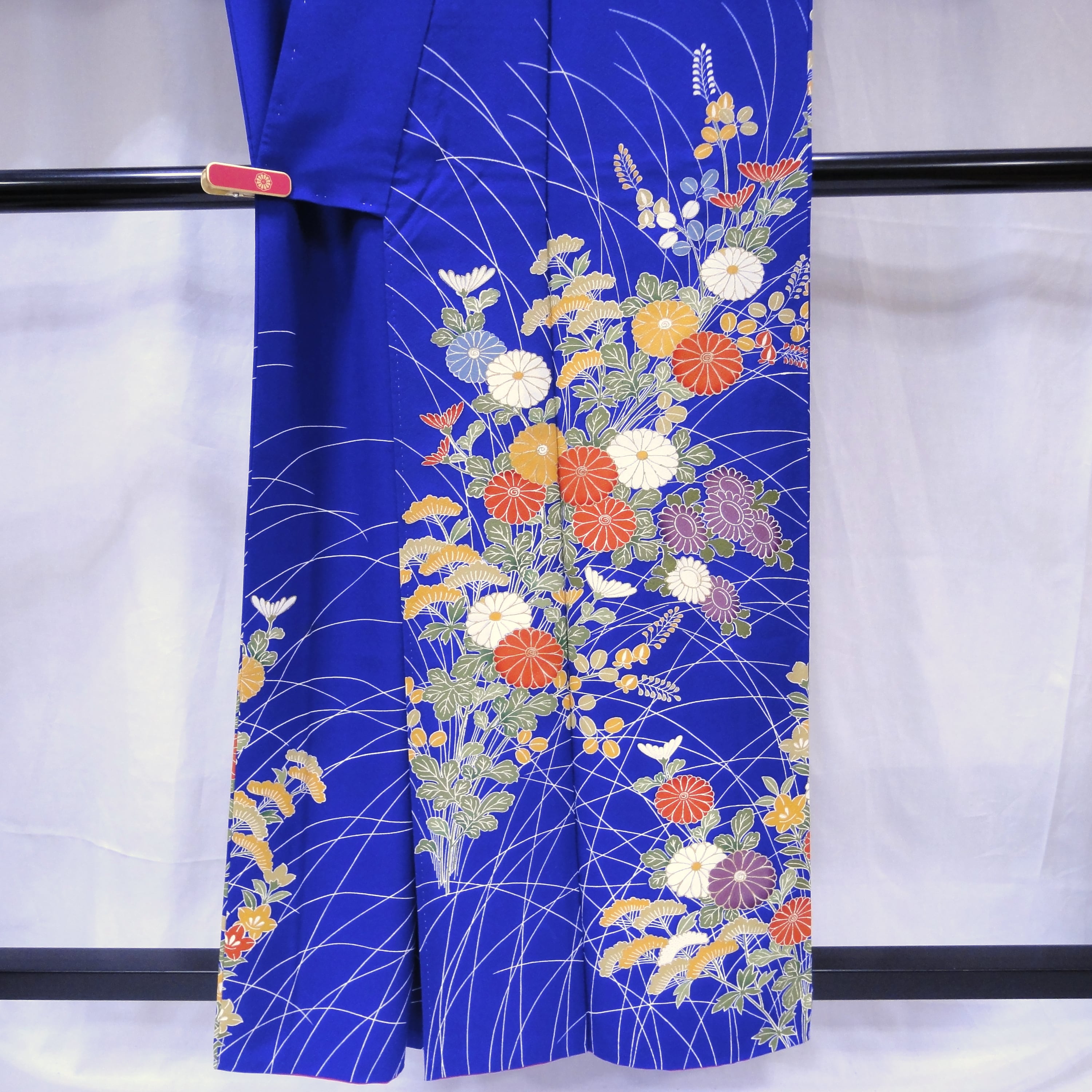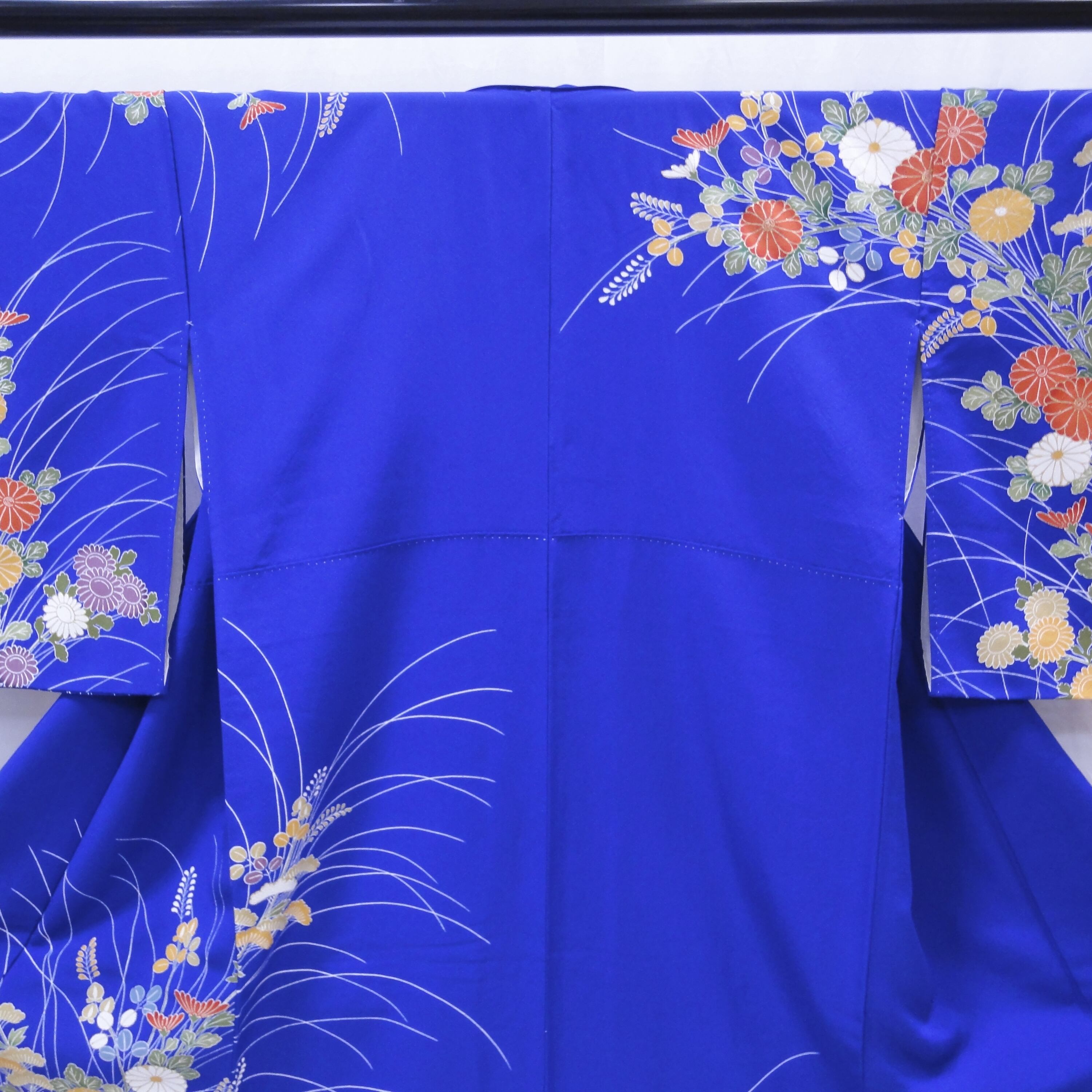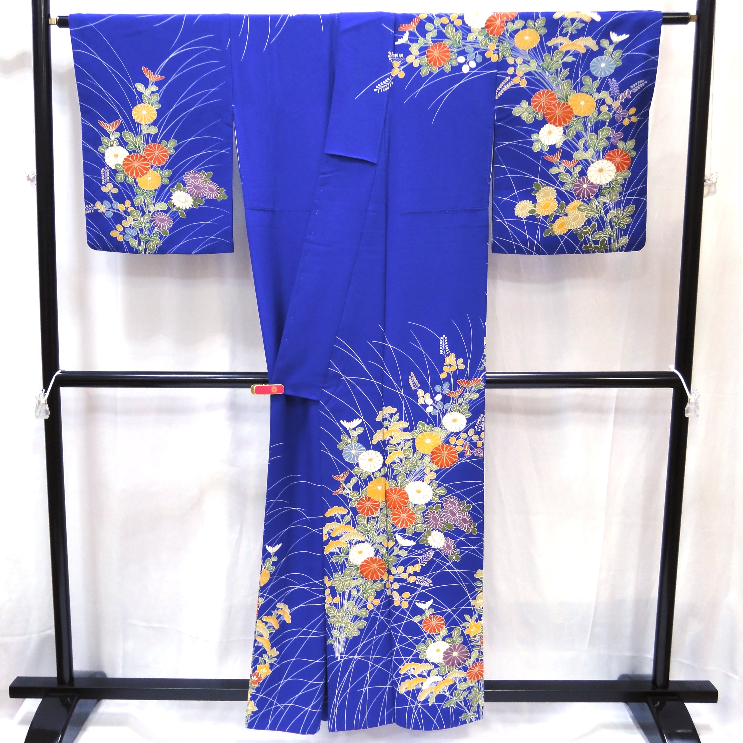 裄:約65㎝、袖:約51㎝、身丈:約160㎝、後幅:約29㎝、前幅:約22.5㎝、状態ランク:C、衿にヨゴレ、菊の柄に黄変あり(画像参照)
